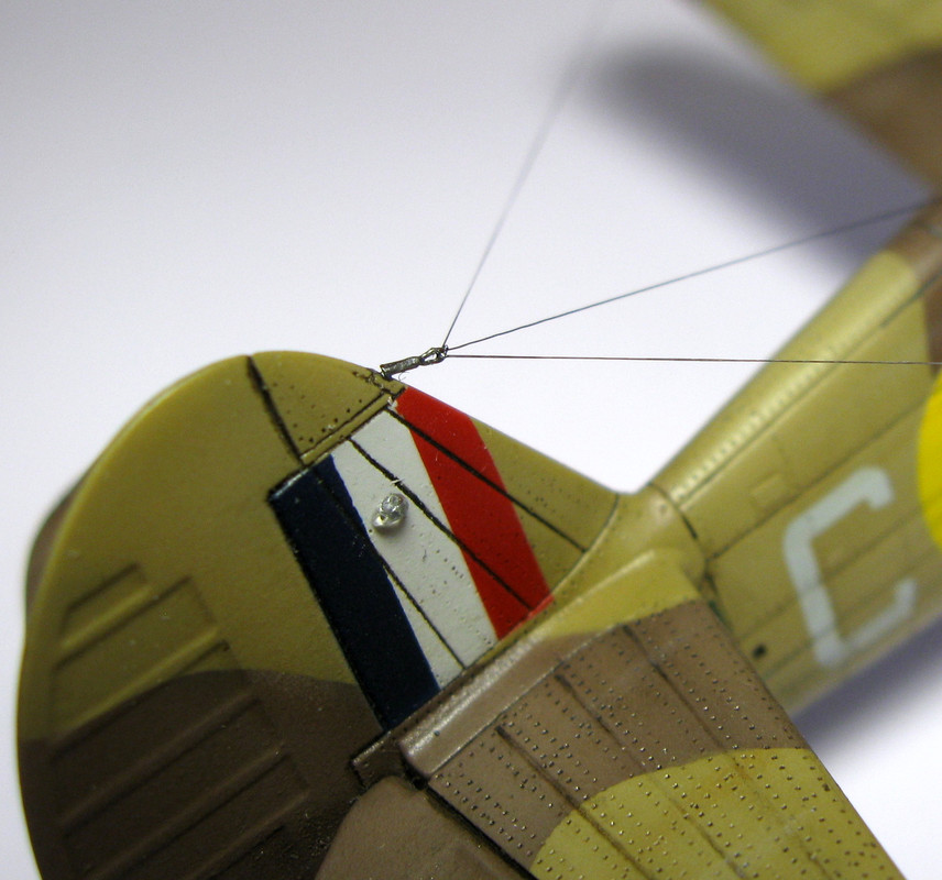 Аккуратненько "общипал" и загрязнил самолет и неторопясь смонтировал мелочи. Бано из набора от фирмы "Эльф", строевые синие огни по бортам прозрачный тянутый литник, вставленный в предварительно высверленные отверстия и залитый синил лаком. Нитка из бантика стала антенной. А прицел фототравление от польского "Мастера" для Р-40. Там их дано с запасом, потому изьял один.