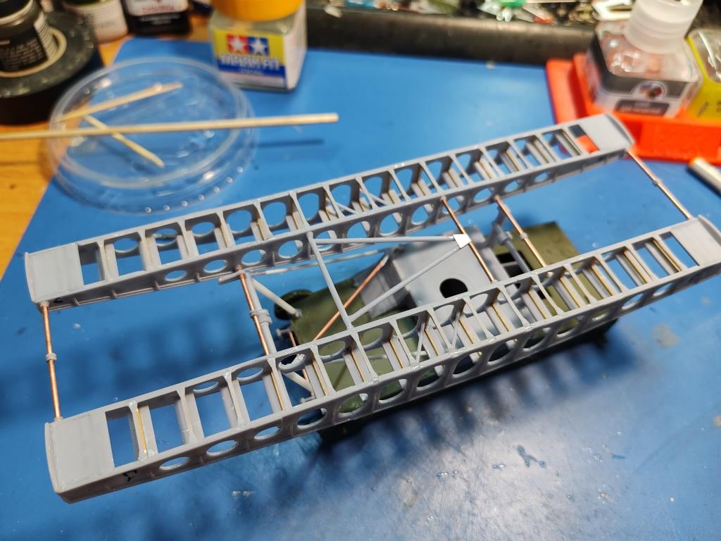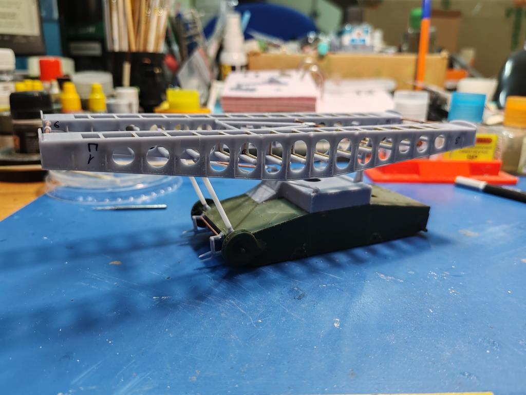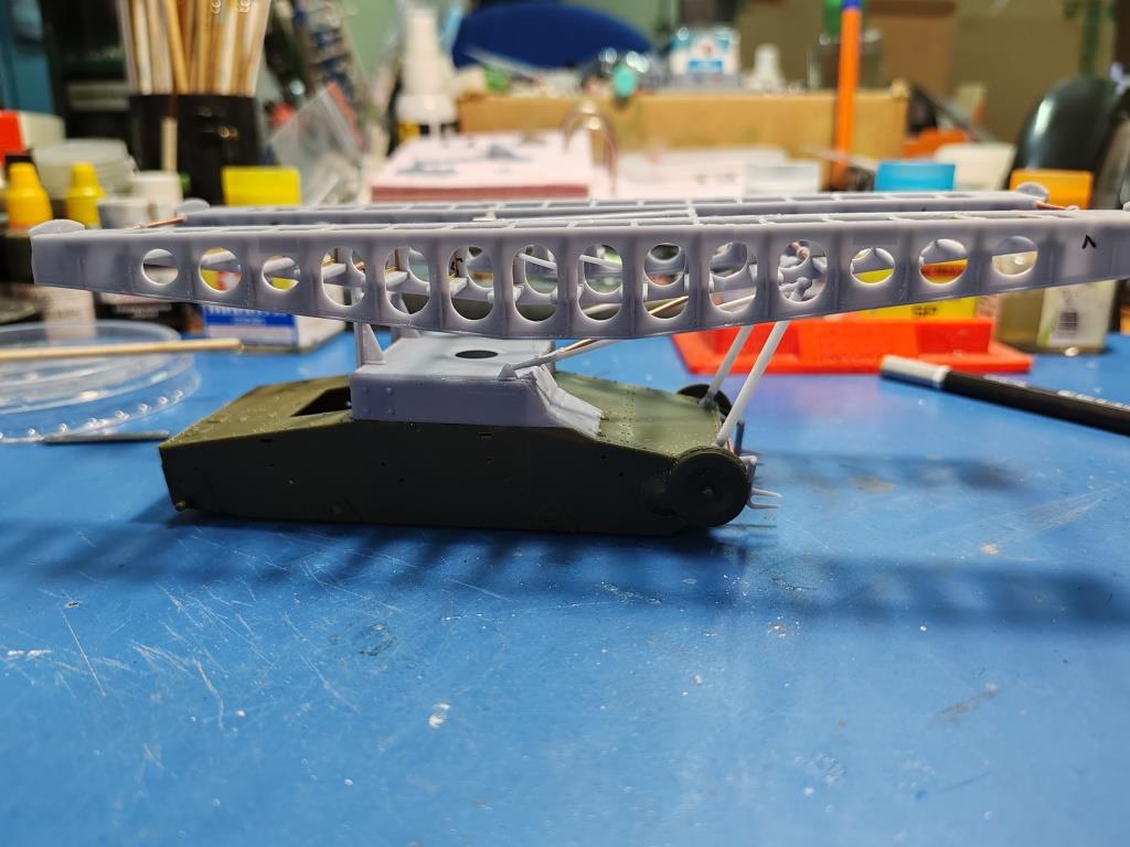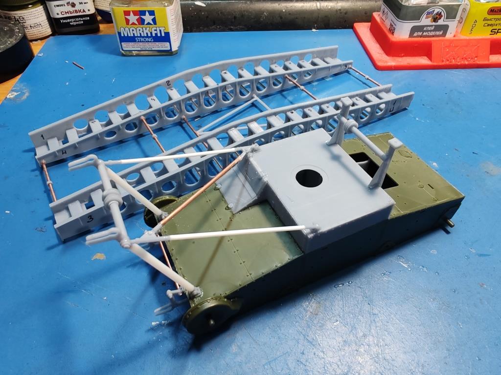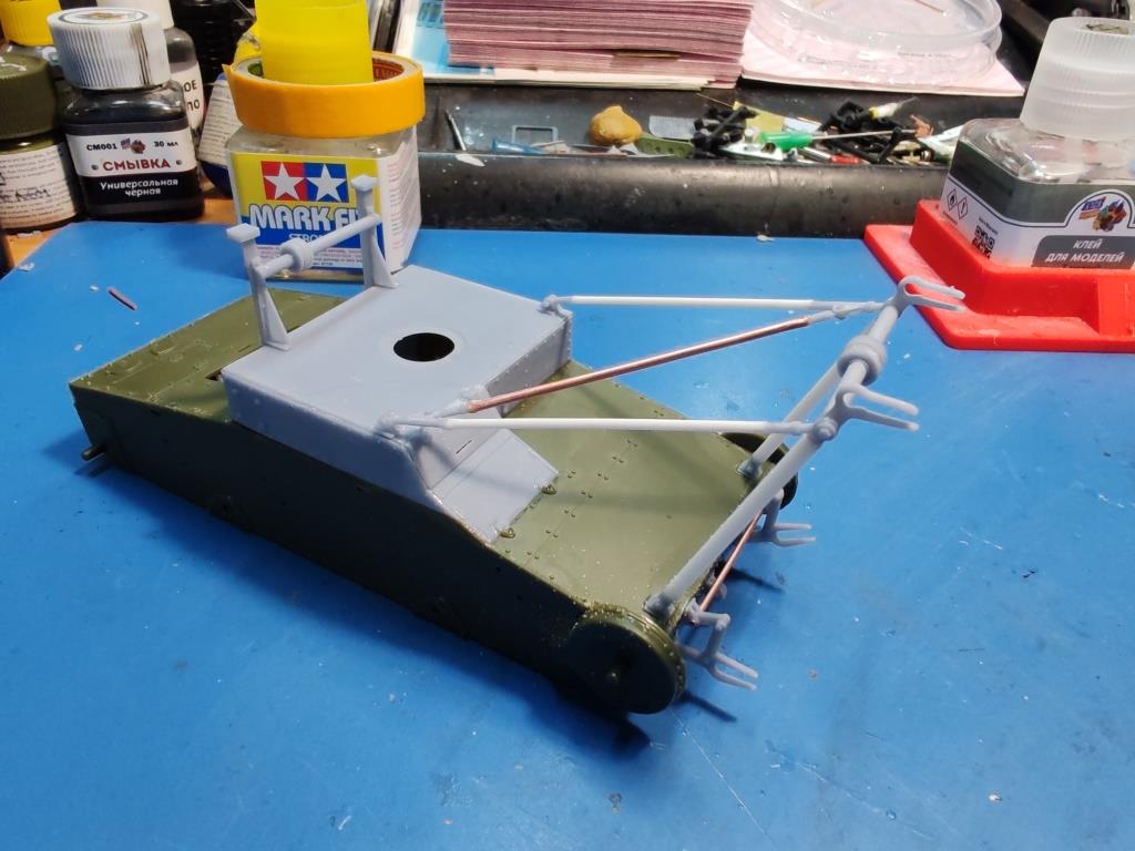 при всей красоте, верхний бронелист корпуса я оставил из набора. ЗД печать конечно хорош, но выемки по краям для четкой стыковки с корпусом не было. Да и садился он по месту чуток не очень. Рубку я собрал на ванне, а не так рак рекомендует инструкция, возможно именно из за этого, при склейке деталей верха на место приложил чуть усилие и результат не заставил себя ждать - излом, пришлось собирать по осколкам, тут уже ничего не поделаешь. Опять же согласно инструкции требовалось приклеить скобы крепежей подъемного механизма, этакие рога. Я так и сделал. Но вот дальнейшая сборка меня напрягла. Во-первых, отверстия в них снова имели меньший диаметр чем прутки, но еще к тому же соединительные болты так же ни в какую не хотели проходить в отверстие и садиться на место. Решение - расточить. но не тут то было ровно подлезть к уже приклеенным деталям практически не возможно. Во-вторых, тут супер клей применил свои свойства на славу, хрен отдерешь. Еще и как обычно мелкие финтифлюшки при демонтаже имели свойство свободного полета в разных направлениях вопреки всем законам физики. В-третьих, и это пожалуй самый важный косячок инструкции, соединительную латунную трубку надо по инструкции вставить чуть ли не под острым углом в направляющие отверстия опор, естественно с меньшим диаметром, но даже если бы он был подходящего размера, все одно ничего не вышло бы без излома. Поэтому отодрал кое-как, я собрал всю эту конструкцию отдельно и только потом установил на корпус. Плюс в том, что эта конструкция подвижна и благодаря рычажным соединениям довольно легко перемещается. Лишь бы не обломалась в дальнейшем.