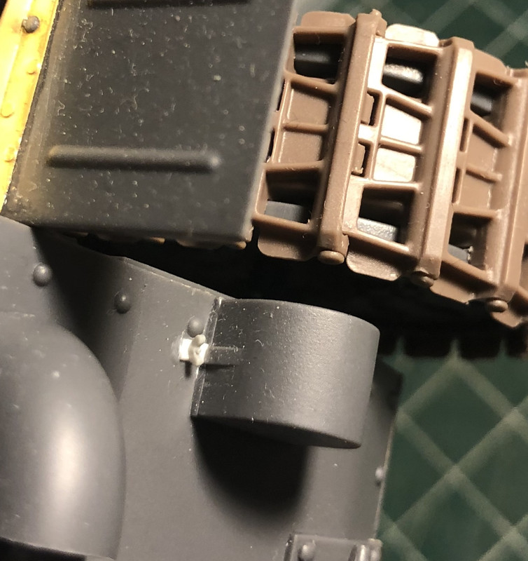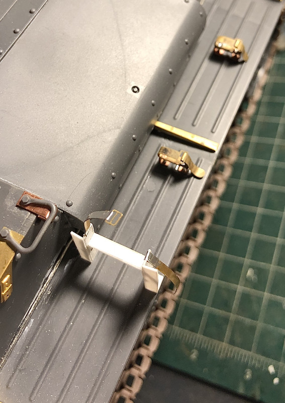 Hart, спасибо! Но там цепочки тоньше, форма затычек посложнее. Осталось вроде бы не так много до грунта. Пытаюсь понять, как немцы так ловко каски цепляли. Понятно, что они подбородочник продевали через кольцо приваренное к болту, но ремешок ещё и застегнуть нужно. А каски притянуты практически вплотную к броне. Задумался про последовательность - после покраски цеплять или до. И то и другое обещает геморрой, осталось понять, какой будет обширней.