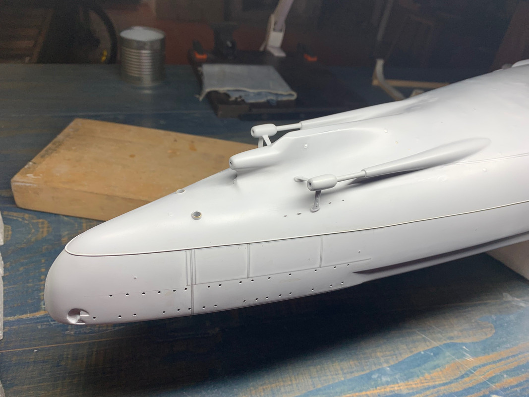 | Привет всем, давно не обновлялся - был в отъезде. Черновую работу с корпусом ниже ватерлинии решил завершить имитацией клёпки противоторпедной переборки. Не знаю, будет ли её видно под краской. Решётки водозаборов пока всё ещё под масками, чтобы не слишком забивать их грунтовкой.