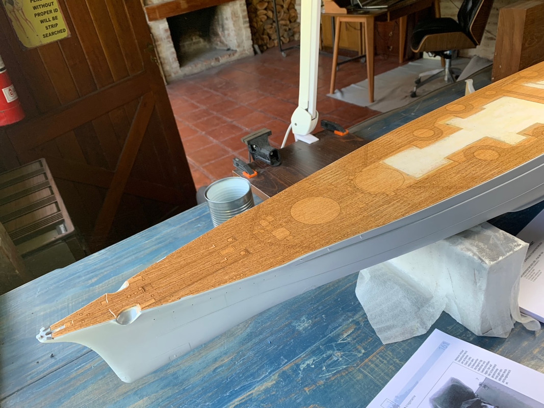 | Само словосочетание "наборная палуба" может звучать как ночной кошмар, но в реальности похоже на сборку пазла. Донорский шпон вырезал из центральной части палубных заготовок, там, где он не нужен, т.к. там будут стоять надстройки. Пустое место уже заклеил тканью. В центральной части палубы небольшие участки стыков листов шпона оставил: под орудийными башнями и в окружении выступающих над палубой вентиляционных шахт их не должно быть видно совсем. Я ожидаю, что обработка шпона тунговым маслом немного сгладит контраст досок, но не сделает палубное покрытие монотонным.