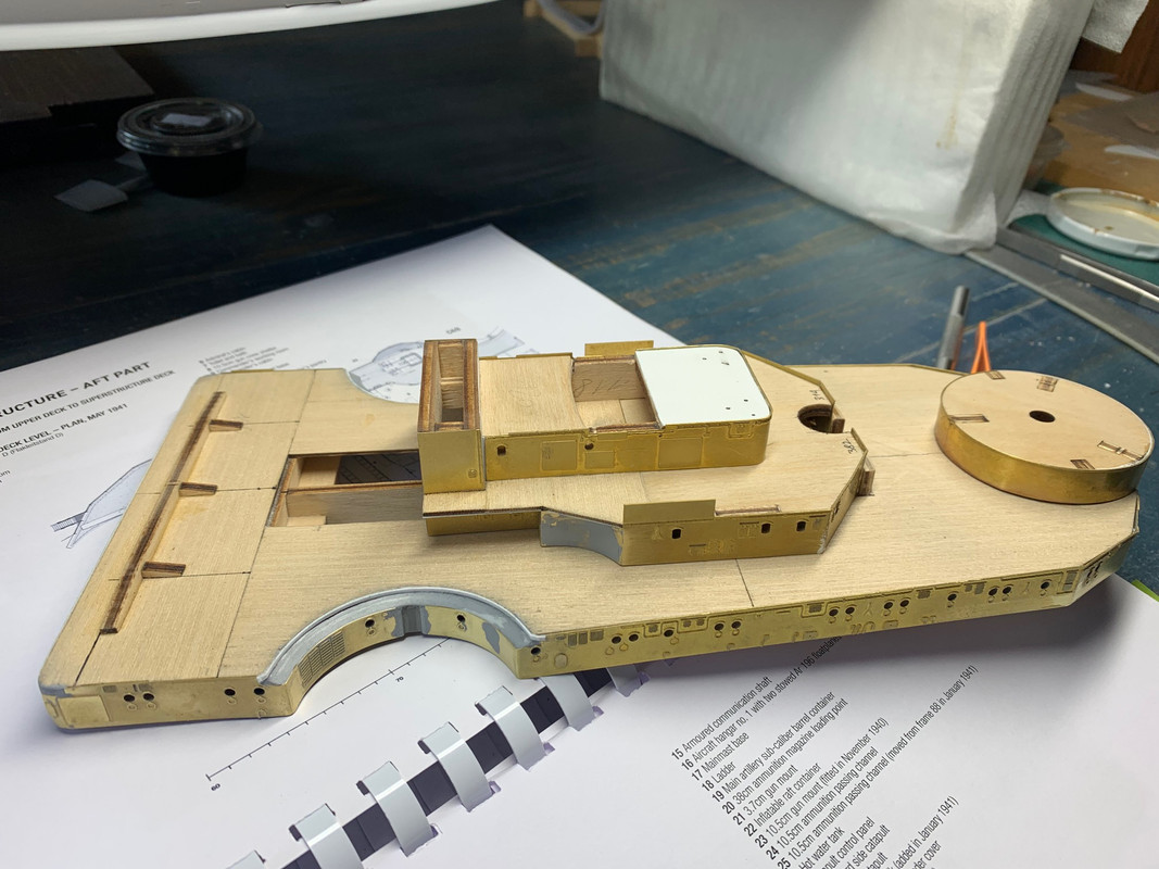 | Привет всем, особо похвастаться нечем, пропитываю палубное покрытие маслом. Когда закончу, перейду к масштабной покраске корпуса. Готовлюсь морально. Пока сохнут слои масла, чтобы не простаивать начал собирать кормовую надстройку. Пока только каркас без кружев, что-то зашпаклевать, что-то подогнать. Делаю с умеренной оглядкой на матчасть. Мостик кормового командного поста будет на самом виду, поэтому решил немного приукрасить его имитацией приборов и датчиков, также полностью срезал постаменты приборов оптического оборудования (это оборудование будет полностью афтермаркет 3д печать, на фото их нет): целеуказатели артиллерии главного калибра и системы управления кормовыми прожекторами.