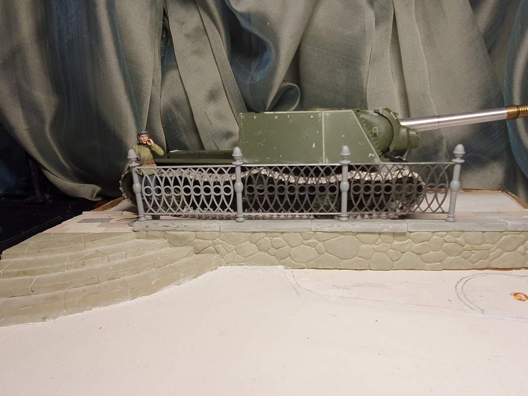 | выложил тротуар и сделал заготовку ограды. Ограда - это немного переделанный набор MiniArt. Я удлинил решетку из набора и скопировал ее в смолу.. Мне казалось, что ограда слишком высокая, поэтому примерил ограду с фигуркой и ИСУ. Вроде нормально. Теперь буду думать как красиво сломать оградку....