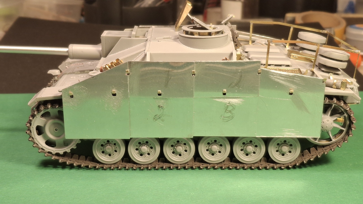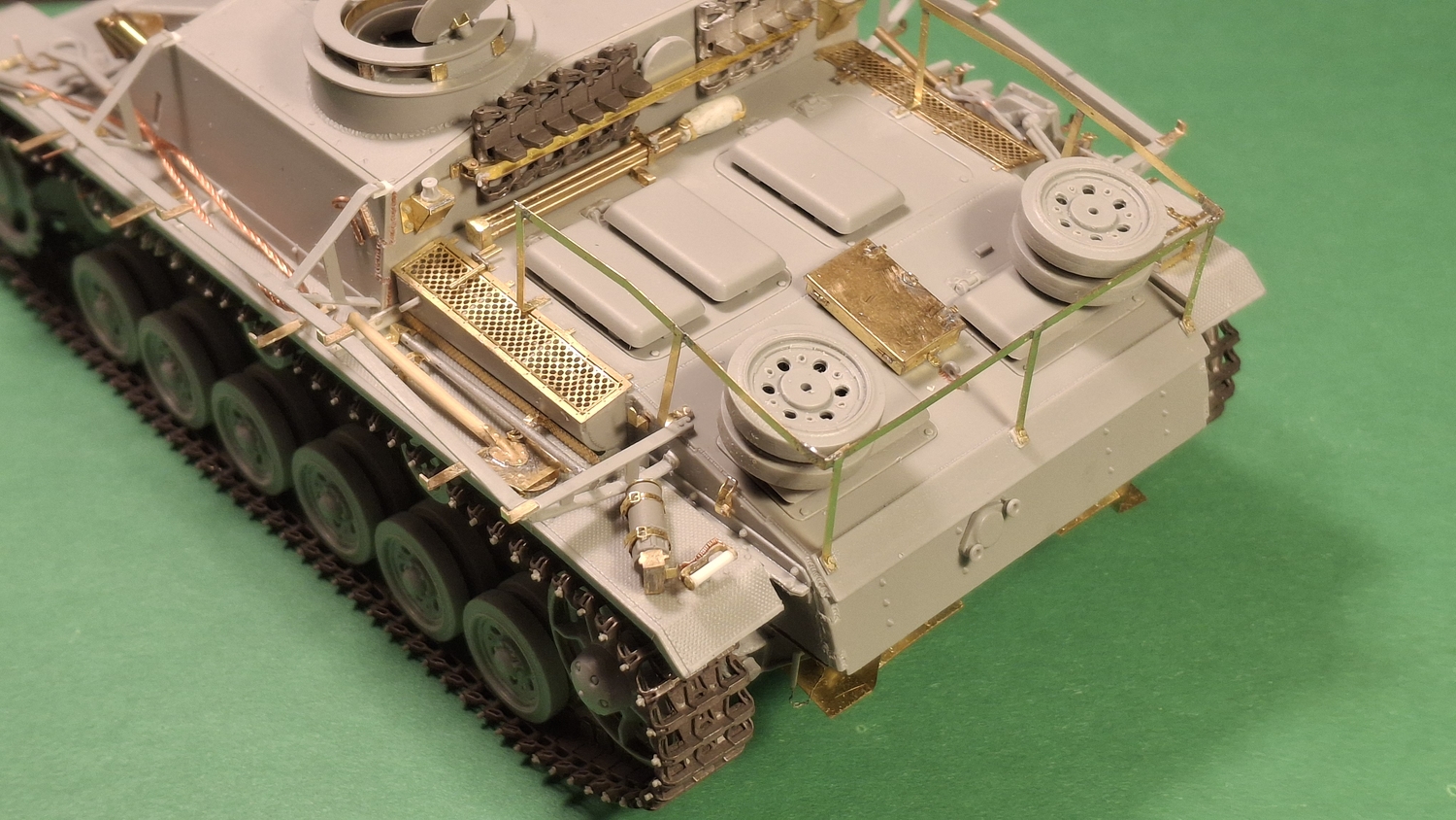На этом фото видно, что некоторые метизы на уголках , на опорах поддерживающих катков и на отбойниках я заменил на корончатые гайки. Так же нужно было зашпаклевать бронировку натяжителя гусеницы.
