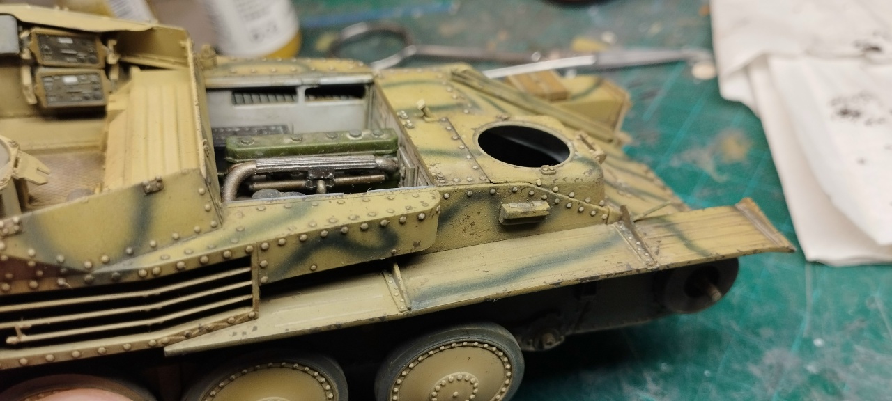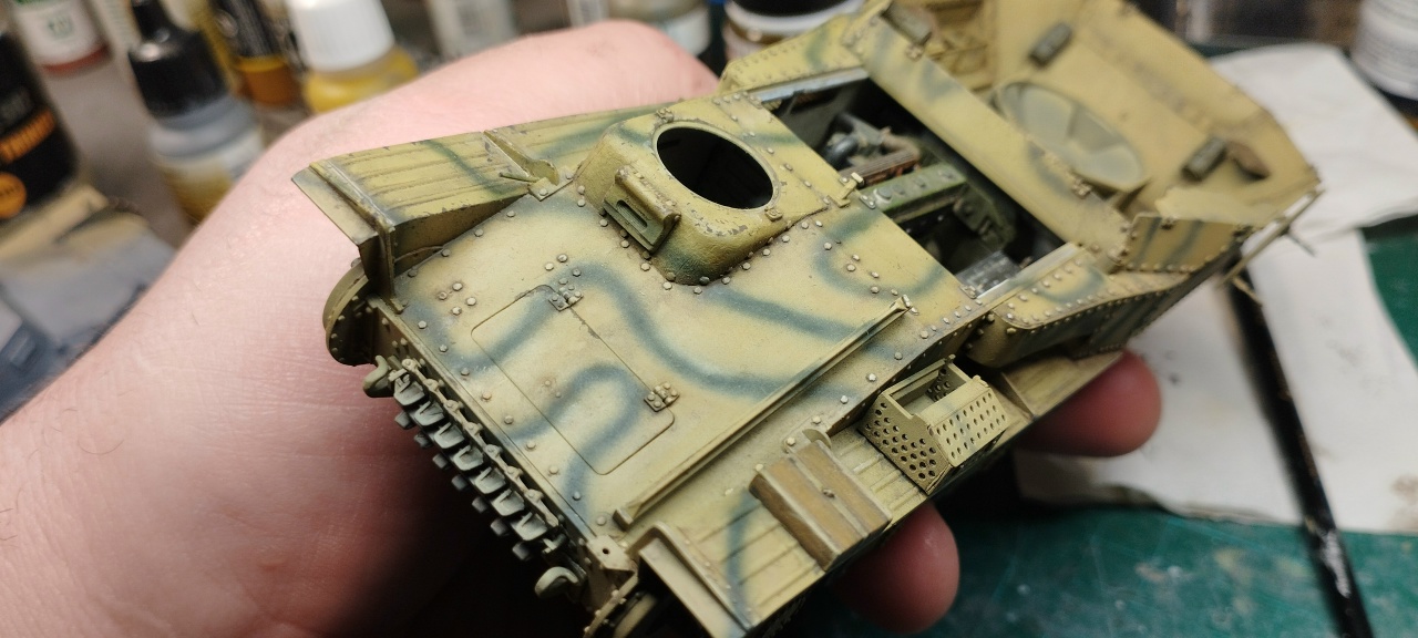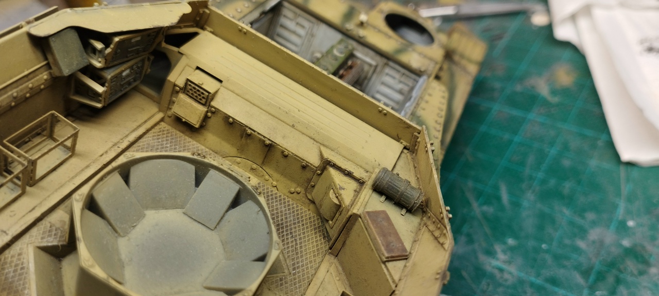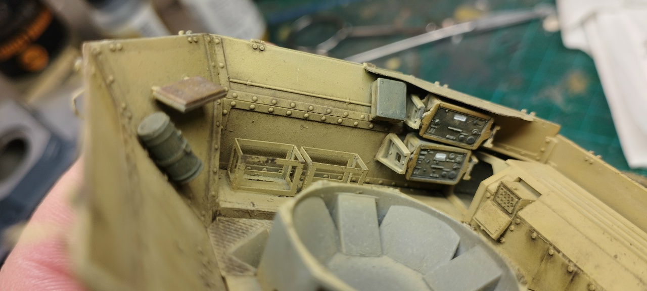 | Всем привет! Цитата Можно базовым цветом осветлённым пройти между зелёными полосами или светлую масляную краску растушевать. Вот насчет масло пожалуй нет,а вот краской слегка,думаю придется. Цитата На мой вкус снаружи нормально. Потом сухой кистью высветить заклёпки и рёбра + потёртости на путях миграции экипажа + сколы по месту, ГСМ. По моторному отсеку,полностью открывать не думал,скорее закрыт будет.Вот где "будка" мехвода открою. Теперь по ящику,там домкрат будет закреплён. Цитата не хватает масляных точек? На ваш взгляд,какие цвета надо?